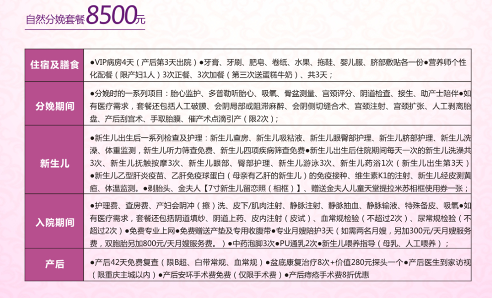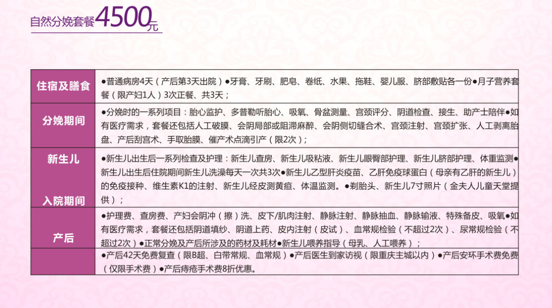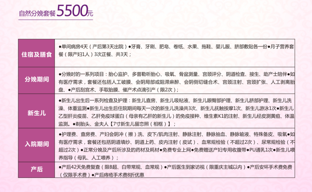 此外,我院现推出“百人顺产计划”,活动期间凡订购我院指定月子套餐,即可享受多重好礼:活动期间,如果孕妈提前购买铂金B类(顺产5500/剖宫产6900)及以上套餐,还可享受孕期产检8折优惠;此外,医院还为每一位顺产的孕妈,准备了一份价值388元的“勇敢辣妈”分娩大礼包;如果您是本地农村户籍孕妇,在我院顺产更可享受400元政府财政补贴(享生育保险报销者除外)。