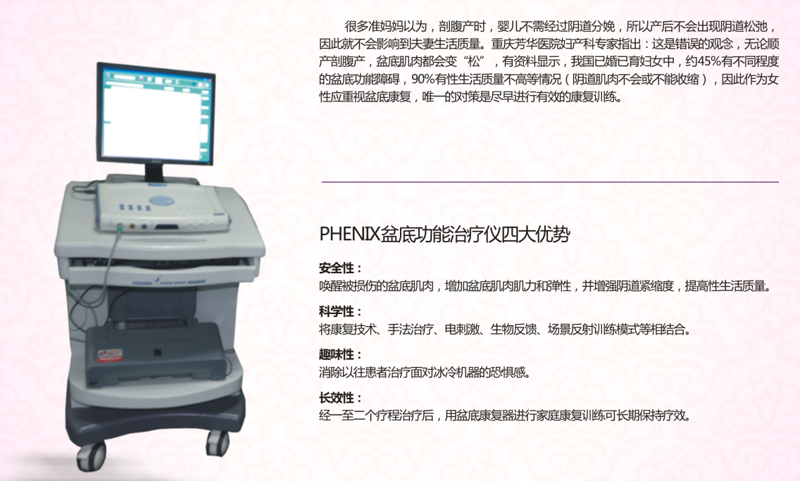 盆底功能康复治疗,是针对产妇尤其是顺产的产妇,无需服用任何药物,无创、无痛、可视、安全,唤醒被损伤的盆底肌肉,增加盆底肌肉弹性,使盆底功能恢复正常,增加阴道紧缩度,提高生活质量,治疗过程如游戏般轻松愉快,躺卧休息即可完成,十分方便。